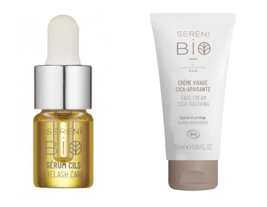 Sérum régénérant cils bio : Corylus avellana (Hazel) seed oil*, Ricinus communis seed oil*, Helianthus annuus (Sunflower) seed oil, Centella asiatica flower/leaf/stem extract*, Tocopherol.