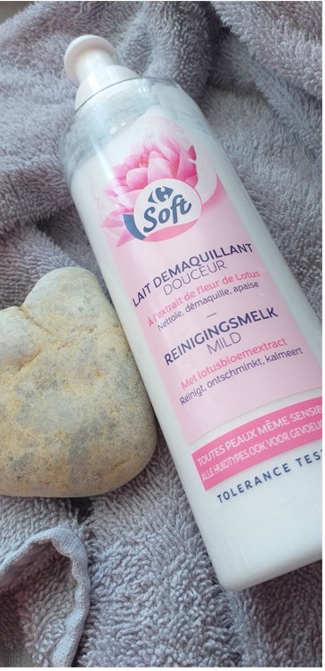 Lait démaquillant Douceur Carrefour : Aqua, Paraffinum liquidum, Ceteth-20, Stearic acid, Sorbitan stearate, Cetyl alcohol, Propylene glycol, Betaine, Phenoxyethanol, Methylparaben, Parfum, Carbomer, Tocopheryl acetate, Tetrasodium EDTA, Sodium hydroxide, Tocopherol, Sorbic acid, Nelumbo nucifera flower extract