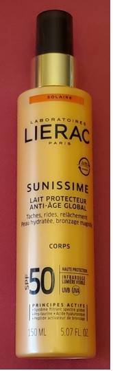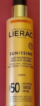Lierac Sunissime lait protecteur anti-âge global SPF 50 : Aqua/water/eau, glycerin, alcohol, diethylamino hydroxybenzoyl hexyl benzoate, dicaprylyl carbonate, butyl methoxydibenzoylmethane, ethyl hexyl salicylate, ethyl hexyl triazone, C12-15 alkyl benzoate, bis-ethylhexyloxyphenol methoxyphenyl triazine, phenylbenzimidazole sulfonic acid, polyglyceryl-3 methylglucose distearate, caprylic/capric triglyceride, triethanolamine, C20-22 alkyl phosphate, C20-22 alcohols, caprylyl glycol, ethylhexylglycerin, potassium cetyl phosphate, acrylates/vinylisodecanoate crosspolymer, laminaria ochroleuca extract, tocopheryl acetate, melanin, sodium gluconate, butylene glycol, polygonum aviculare extract, oxothiazolidine, sodium hyaluronate, pentylene glycol, tocopherol, biosaccharide gum-4, acetyl hexapeptide-1, dextran, sodium benzoate, potassium sorbate, phenoxyethanol, parfum/fragrance.