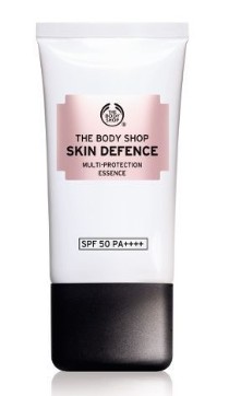 Essence Multi-Protection SPF 50 Skin defence : Aqua/Water/Eau, Alcohol Denat., Ethylhexyl Methoxycinnamate, Neopentyl Glycol Diheptanoate, Butyl Methoxydibenzoylmethane, Butylene Glycol, Dimethicone, Glycerin, Polymethyl Methacrylate, Cetearyl Alcohol, Phenoxyethanol, Octocrylene, Chlorphenesin, Acrylates/C10-30 Alkyl Acrylate Crosspolymer, Cetearyl Glucoside, Sclerocarya Birrea Seed Oil, Parfum/Fragrance, 3-O-Ethyl Ascorbic Acid, Sodium Hydroxide, Palmaria Palmata Extract, Carbomer, Linalool, Tocopherol, Limonene, Citronellol (https://www.thebodyshop.com/fr-fr/soins-visage/soins-de-jour/essence-multi-protection-spf50-skin-defence/p/p001071).