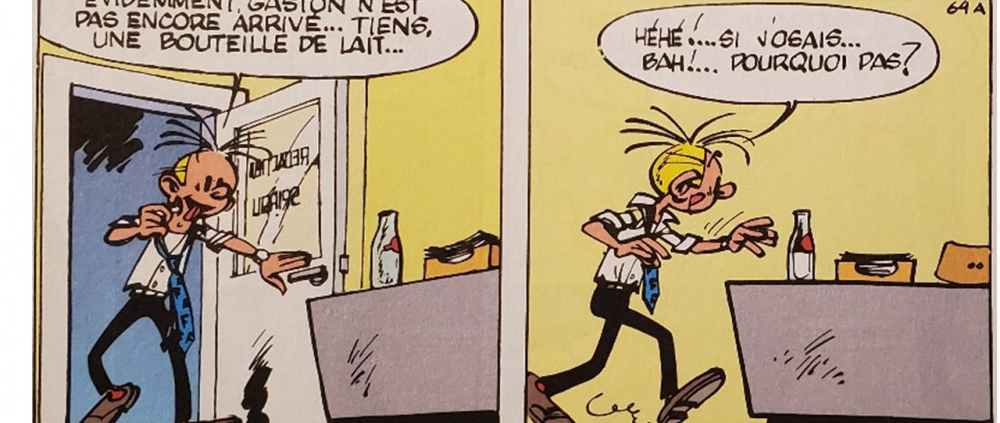 Conditionner de la colle dans une bouteille de lait… c’est dangereux.1 Fantasio en a fait les frais, en voulant se désaltérer avec le contenu d’une bouteille trouvée sur le bureau de Gaston Lagaffe. Malheureusement, cet employé peu modèle, qui a plus d’idées saugrenues que d’idées subtiles, a eu la mauvaise idée de conditionner de la colle (qui ne se boit pas) dans un emballage correspondant à une boisson (qui se boit !).