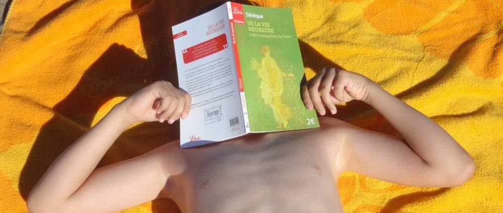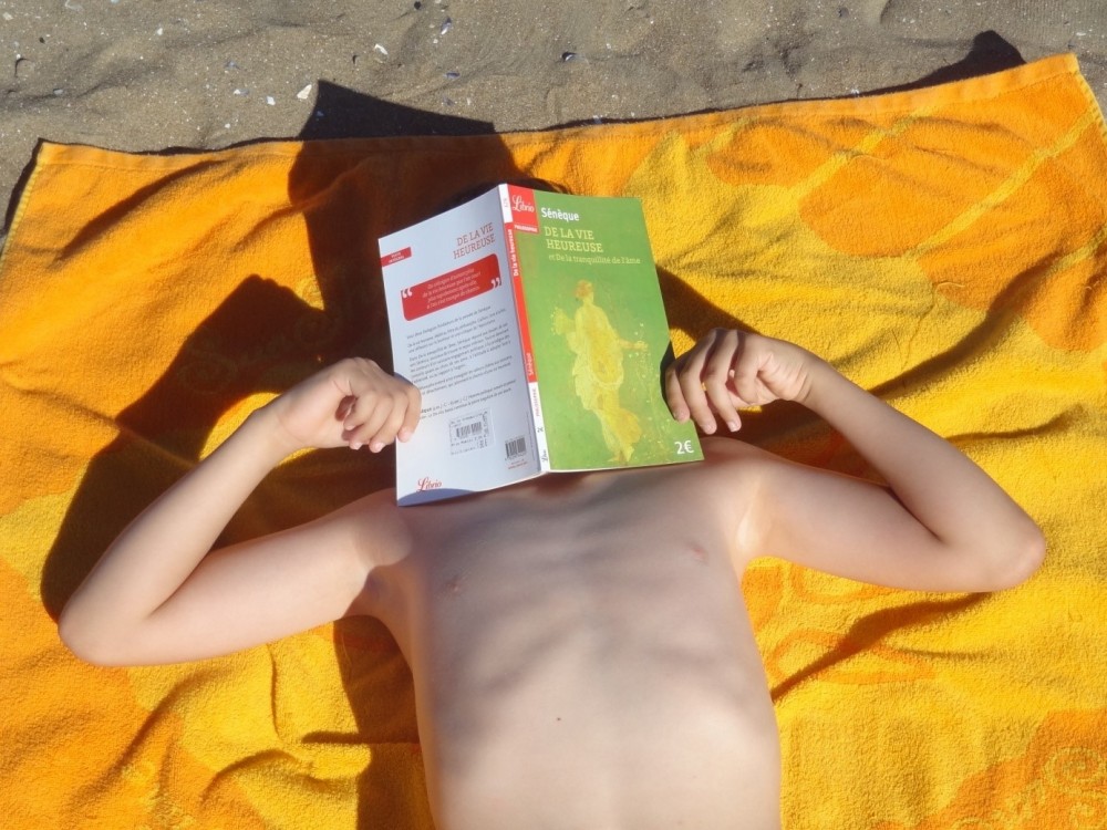 Un très jeune lecteur de Sénèque qui se reconnaîtra nous souffle, malicieusement, une autre façon d’utiliser un livre, après ou avant le bain (de mer) … il s’agit de s’en servir d’écran vis-à-vis du soleil ! Merci à lui d’avoir permis l’illustration de ce Regard !