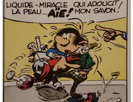 Gaston Lagaffe aime jouer au petit chimiste dans son bureau de la rédaction du journal Spirou. Là il met au point toutes sortes de préparations plus saugrenues les unes que les autres. Jusqu’au jour où il s’imagine devenir riche en mettant au point « un savon liquide adoucissant » !1