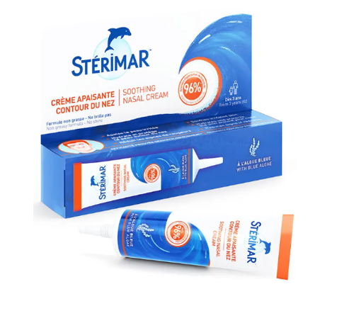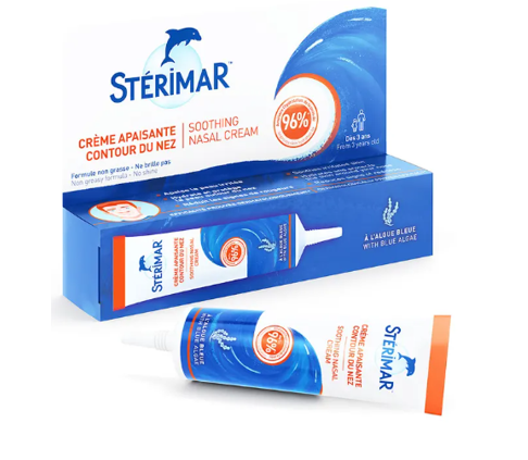Crème apaisante contour du nez Stérimar : Aqua, Cetyl Alcohol, Stearyl Alcohol, Glyceryl Stearate SE, Isopropyl Palmitate, Ceteareth-20, Phenoxyethanol, Glycerin, Allantoin, Prunus Amygdalus Dulcis Oil, Tartaric Acid, Sodium Citrate, Citric Acid, Spirulina Platensis Extract, Maltodextrin, Sodium Benzoate, Aloe Barbadensis Leaf Powder, Chamomilla Recutita (Matricaria) Flower Extract