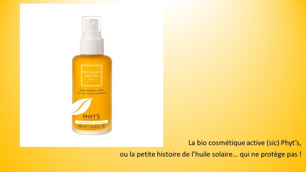 Très étrange est l’Huile solaire de la marque Phyt’s. Sur le site de la marque, il est indiqué qu’elle est composée de « Ylang-ylang, Germe de blé, Vitamine E naturelle ». C’est pour le moins laconique et forcément incomplet. En ce qui concerne l’ylang-ylang, il s’agit (sûrement ? sans doute ? peut-être ?) de l’huile essentielle, allez savoir… Que recouvre « germe de blé », allez encore savoir… Quant à la vitamine E dite naturelle, c’est avant tout de la vitamine E (mais évidemment rien à redire sur cet ingrédient). Donc ici, pas de filtre… donc pas de SPF ! Il fallait littéralement un génie marketing pour le faire et Phyt’s l’a fait : une huile solaire, « sans protection solaire » comme indiqué sur le flacon du produit, qui ne protège pas du soleil (si l’on désire être plus logique, c’est pas possible). Où ça se corse encore, c’est quand on lit que l’huile est à « appliquer sur la peau déjà hâlée, avant et après exposition ». On lit bien « avant exposition ». Or avant une exposition, on doit appliquer un produit qui protège, sauf que là c’est une huile… qui ne protège pas ! Vous comprendrez qu’on n’aime pas (mais alors pas du tout !) et qu’on dit « ATTENTION DANGER » !!!