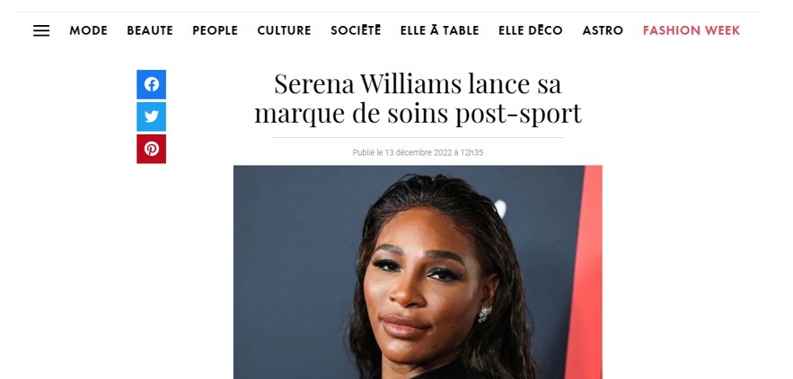 En décembre 2022, le magazine Elle fait écho à la marque de soin « post-sport » (pas facile à dire !) mise au point par Serena Williams. A peine en retraite, la jeune mamie du tennis de 41 ans troque le bandeau serre-tête en éponge pour la casquette de la Business Woman ! Il faut dire qu’après 25 ans de carrière,1 des Grands Chelems en veux-tu, en voilà, des paquets d’ampoules au pied, des déchirures musculaires et autres pépins de santé, la Vénus des cours s’y connaît un peu en produits qui font du bien.