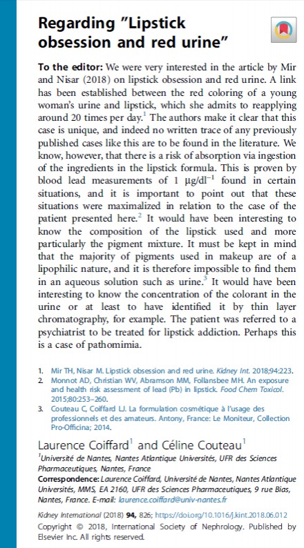 Une patiente qui abusait de rouge à lèvres a vu ses urines se colorer en rouge ! Toutefois, il paraît peu probable de faire un lien de cause à effet !